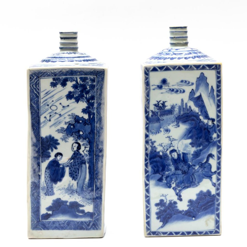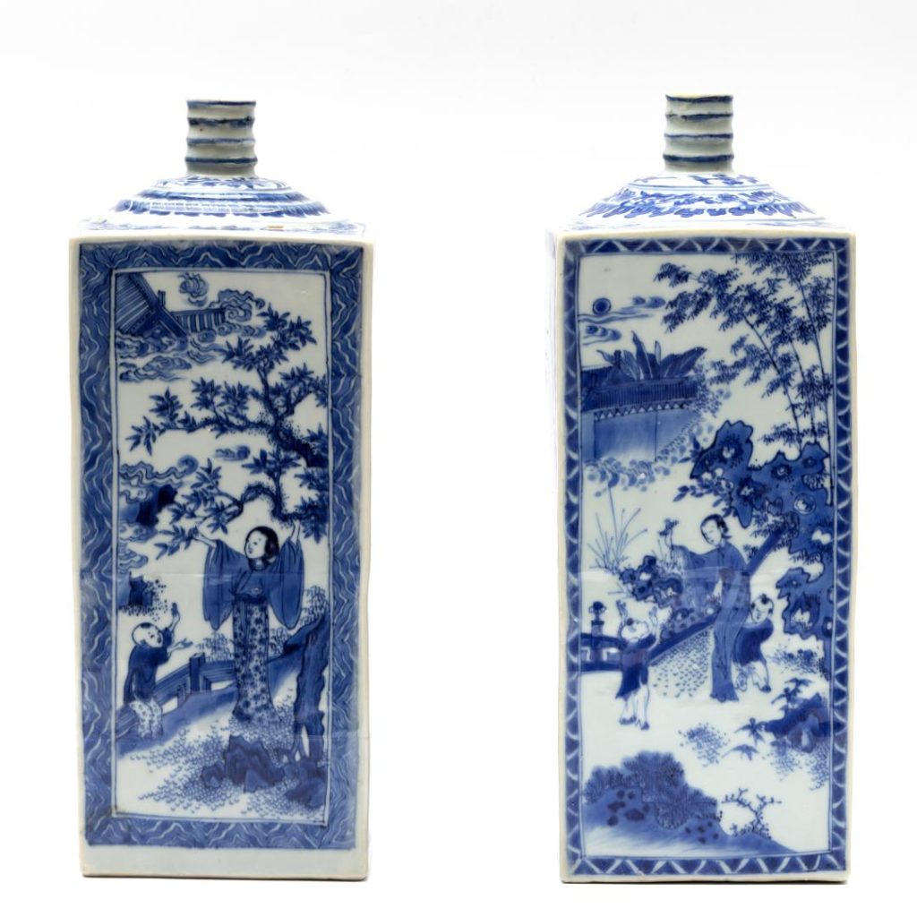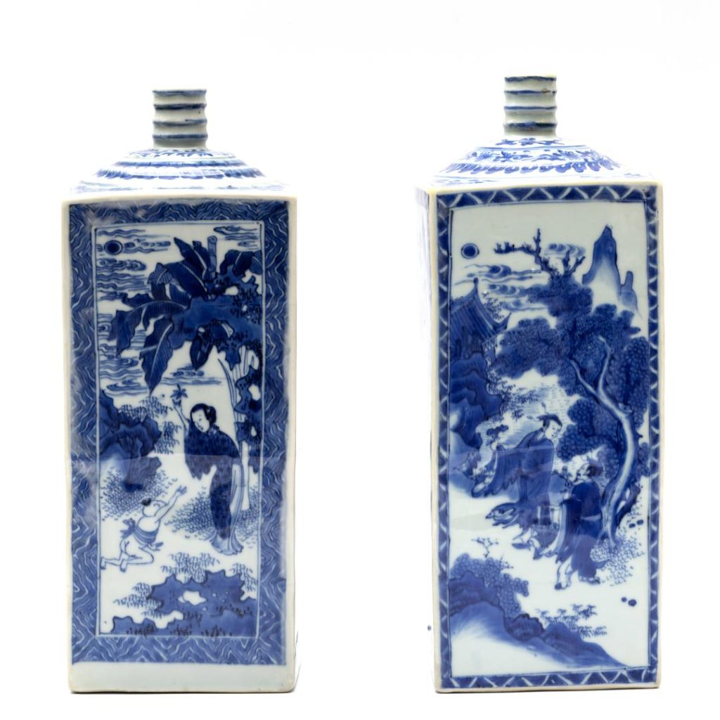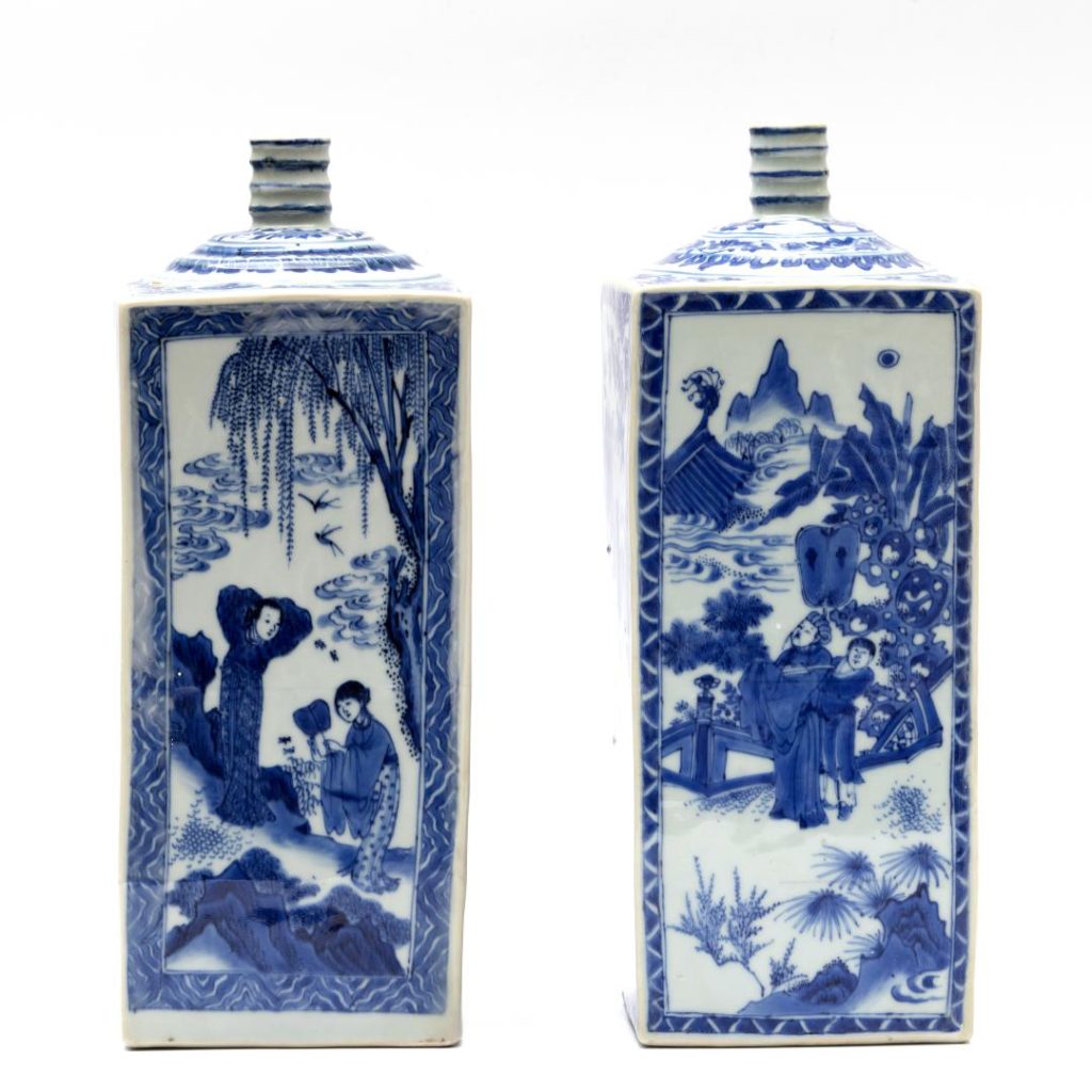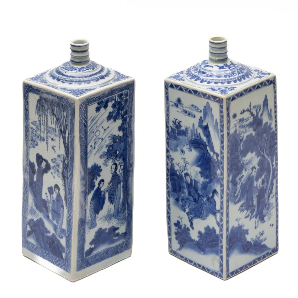 Lotnummer 2805 bestaat uit een paar Chinese gelijkende vierkante blauwwit porseleinen flessen, Kangxi periode (1662-1722), 17e eeuw