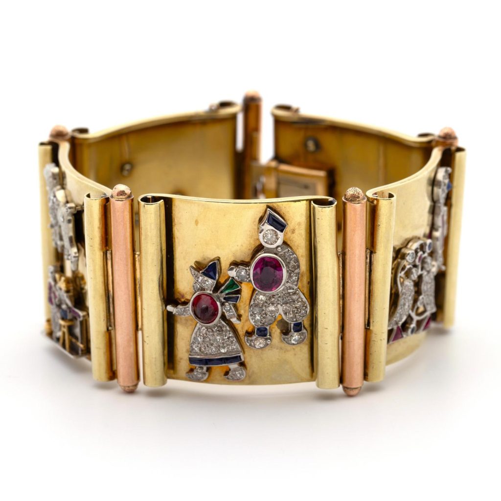 Een bijzonder novelty sieraad dat zowel de jaren ‘20 als de jaren ‘50 verbeeldt is lotnummer 131. Het is een kapitale brede geel-met roodgouden Retro armband waar originele platina Art Deco bedels op gemonteerd zijn met voorstellingen van een cocktailbar, een telefoon, een poedel en zelfs een Nederlands aandoend boeren stelletje. Het is een tweeledig conversation piece. De oude bedels in een moderner jasje in inmiddels een wederom bijna antiek juweel.