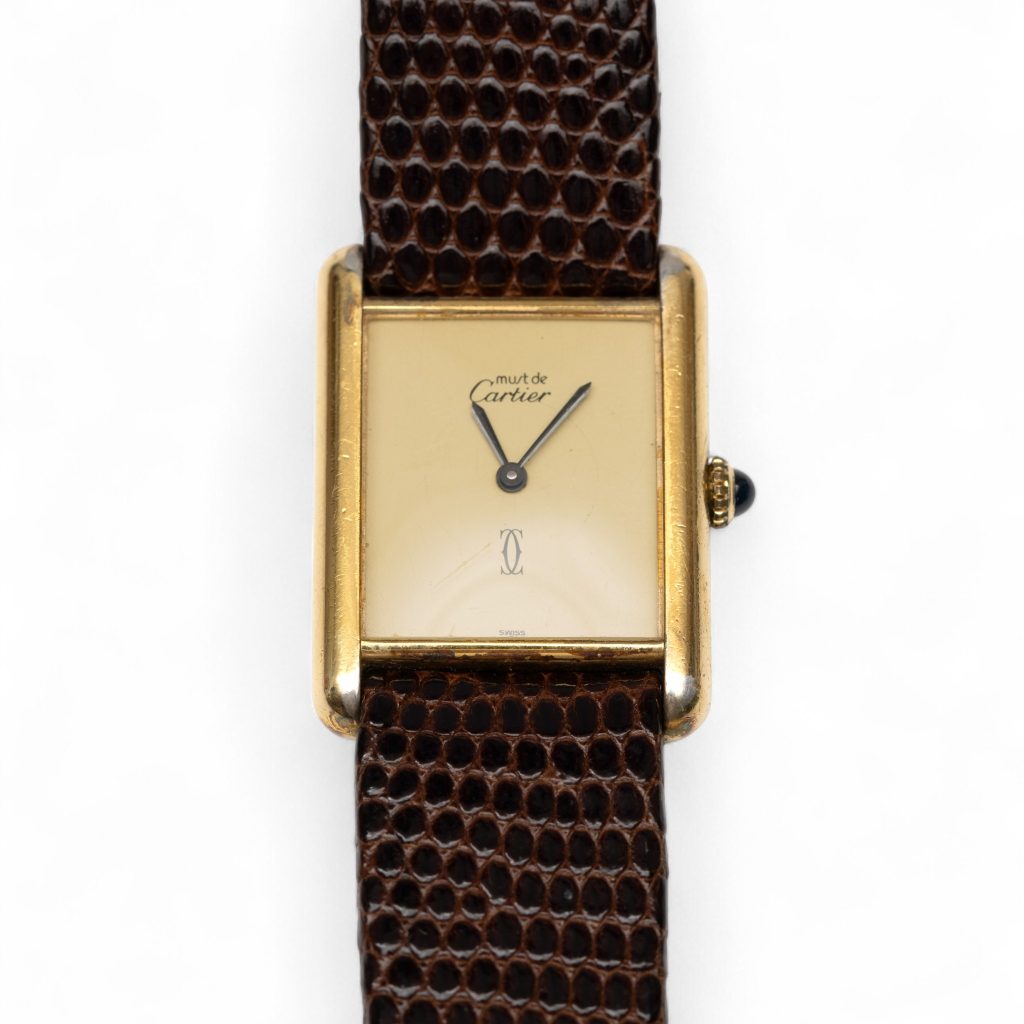 - Lotnummer 625: Must de Cartier, verguld zilveren horloge. Model tank, gedateerd 1981