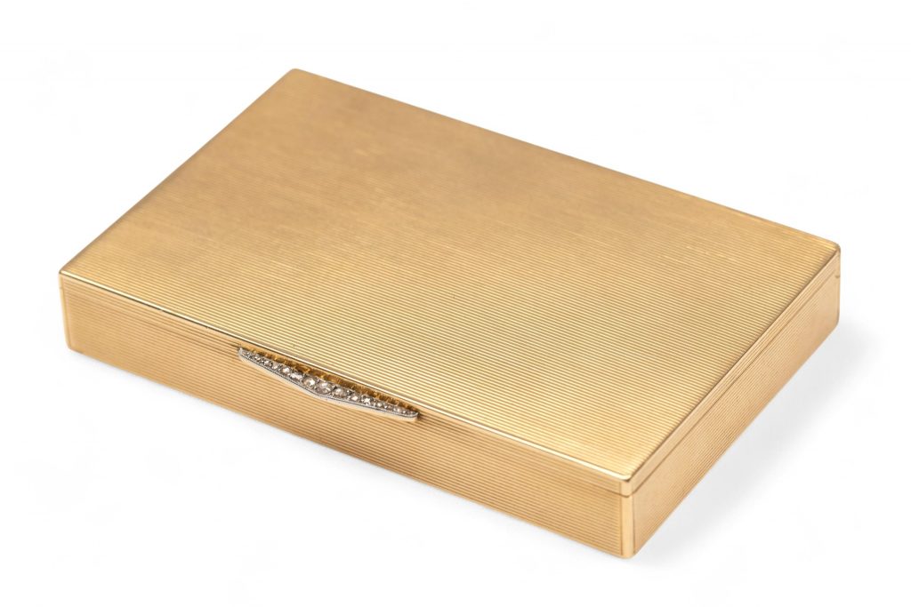 - Lotnummer 103: Cartier, 18 kt. gouden doosje, jaren ’20 – ’30. Gesigneerd Cartier Paris, Made in France. Meesterteken Charles Holl